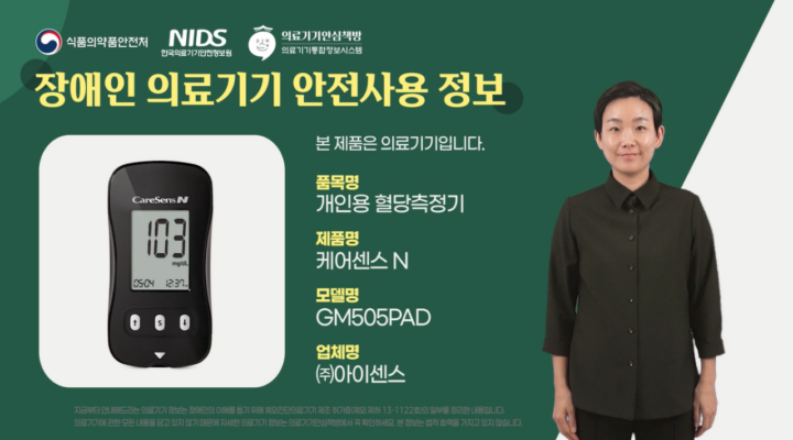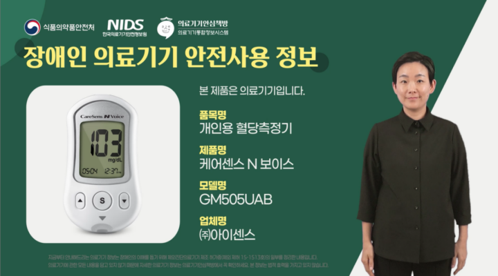 [케어센스 N 보이스] 케어센스 N 보이스 개인용 혈당측정기 안전 정보 (음성•수어) 영상을 소개합니다 케어센스 N 보이스 개인용 혈당측정기 안전 정보 (음성•수어) 영상을 소개합니다. 본 영상은 한국의료기기안전정보원 『의료기기 업체용 장애인 안전정보 콘텐츠 제공 사업』