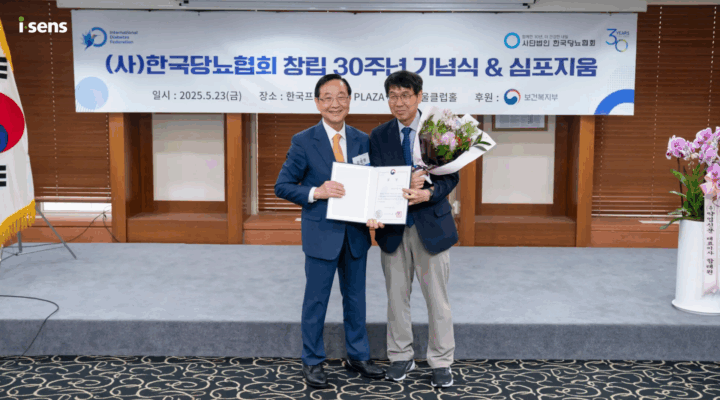 아이센스, 한국당뇨협회 창립 30주년 기념식서 보건복지부 장관상 수상 아이센스, '대국민 당뇨병 교육 유공자’로 선정 당뇨병 인식 개선과 예방에 기여한 공로 인정 받아 한국당뇨협회 김광원 회장(왼쪽)과 아이센스 남학현 대표(오른쪽)의