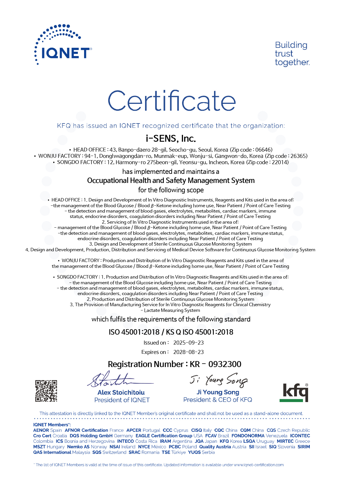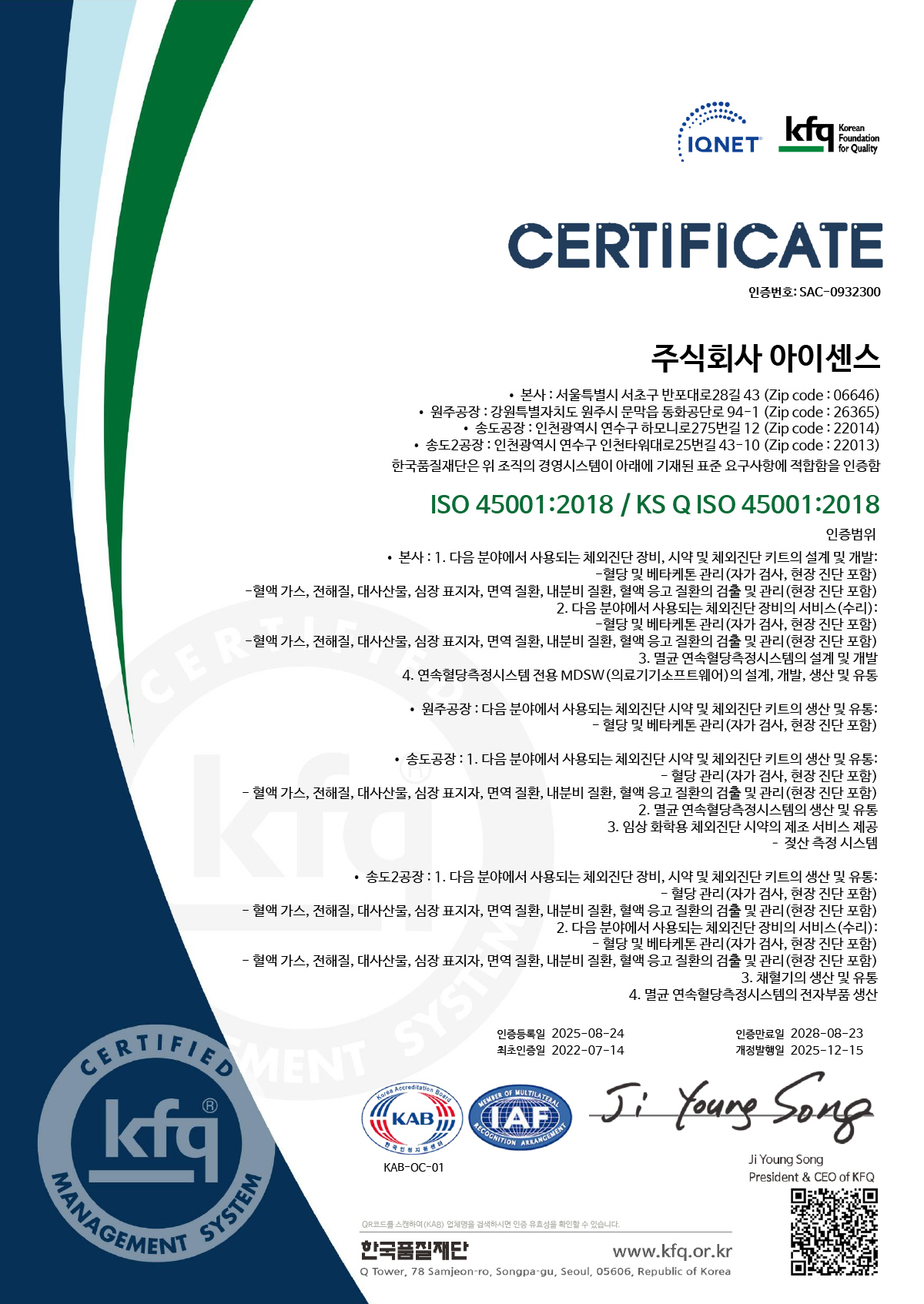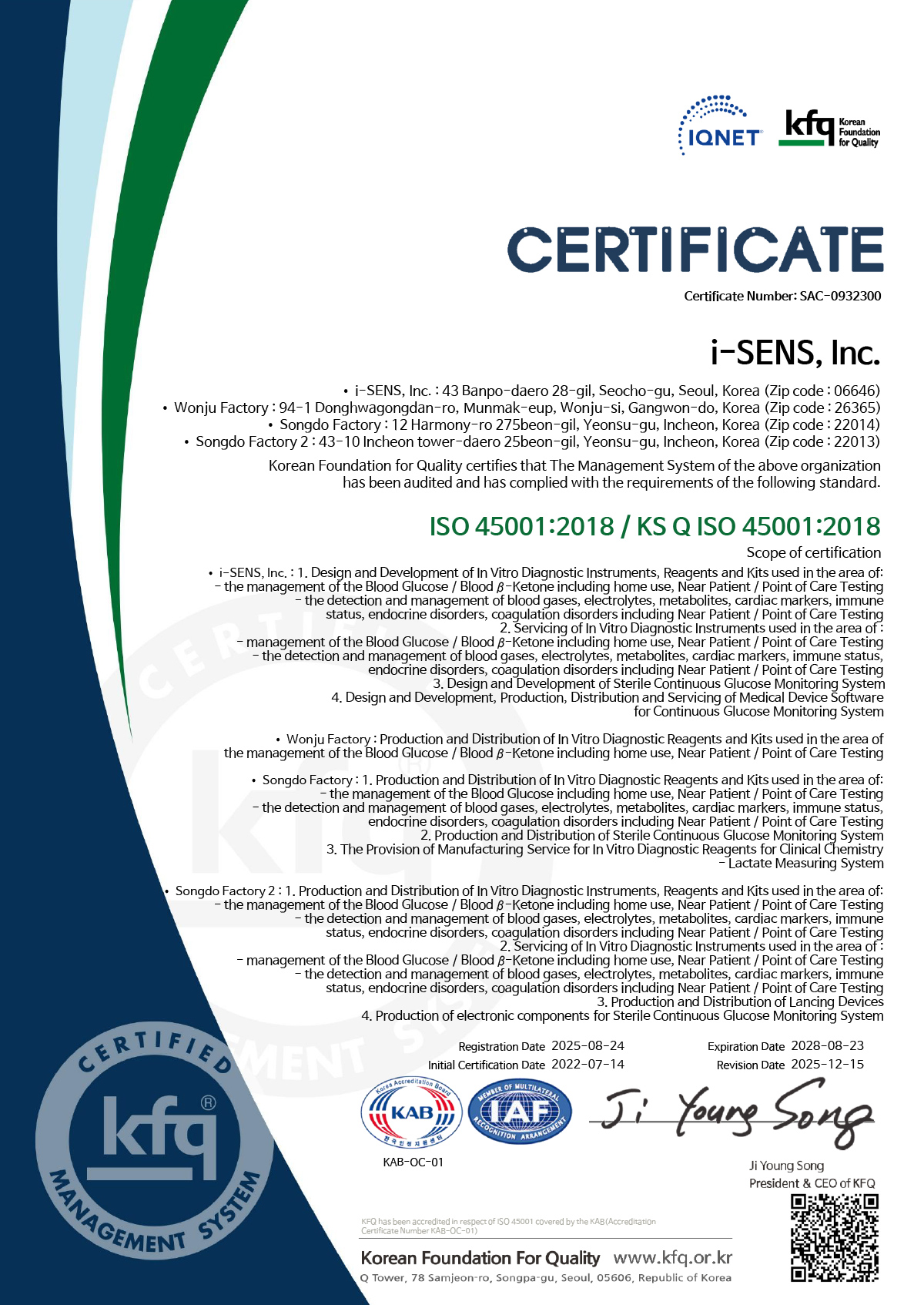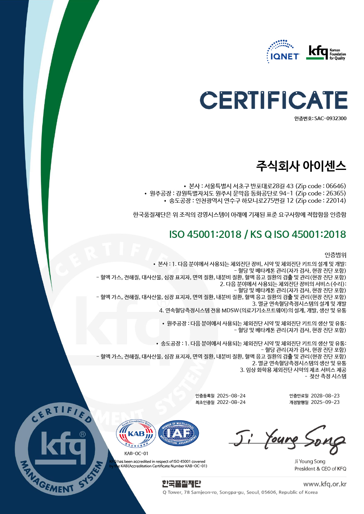 아이센스는 안전보건 국제표준 ISO 45001:2018 인증을 취득하여 안전보건경영시스템을 운영하고 있으며, 근로자에게 안전하고 건강한 근무환경을 제공하며, 산업안전보건 관계 법령 등을 준수하는 것을 기업의 경영방침으로 정하고 이에 따른 안전보건 관리 체제를 구축하였습니다.
