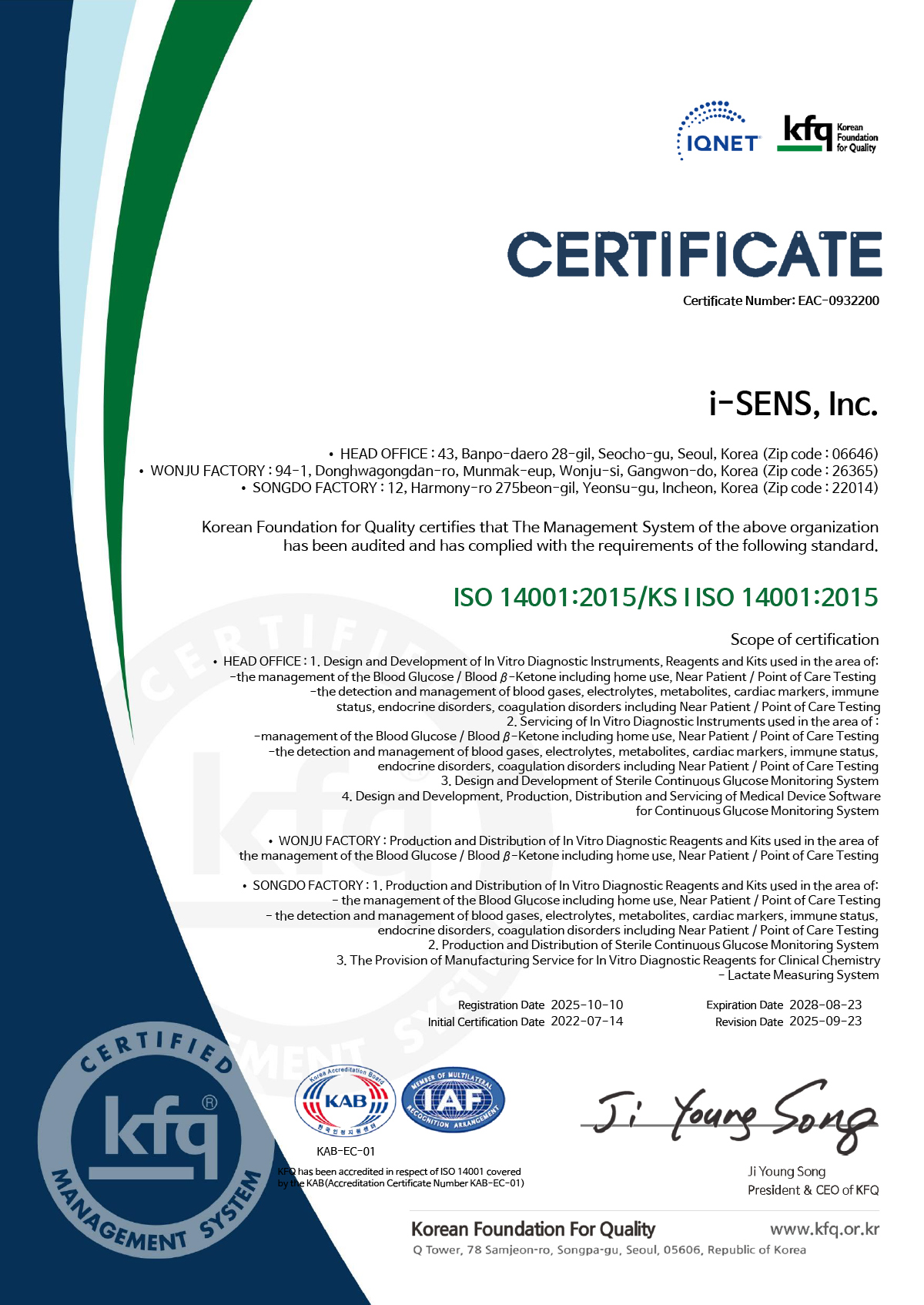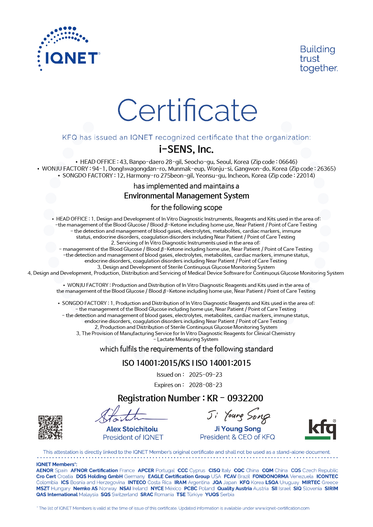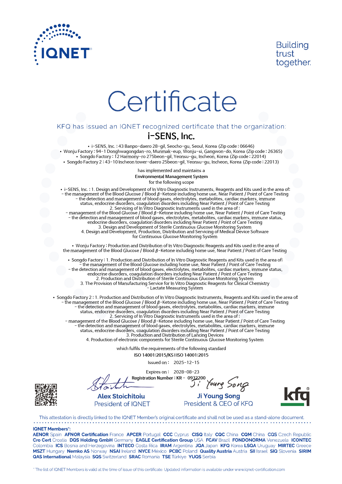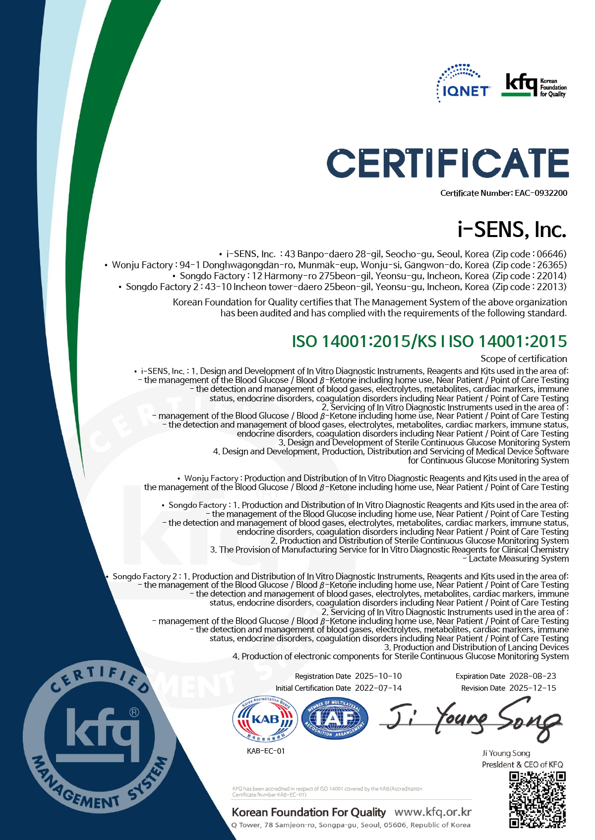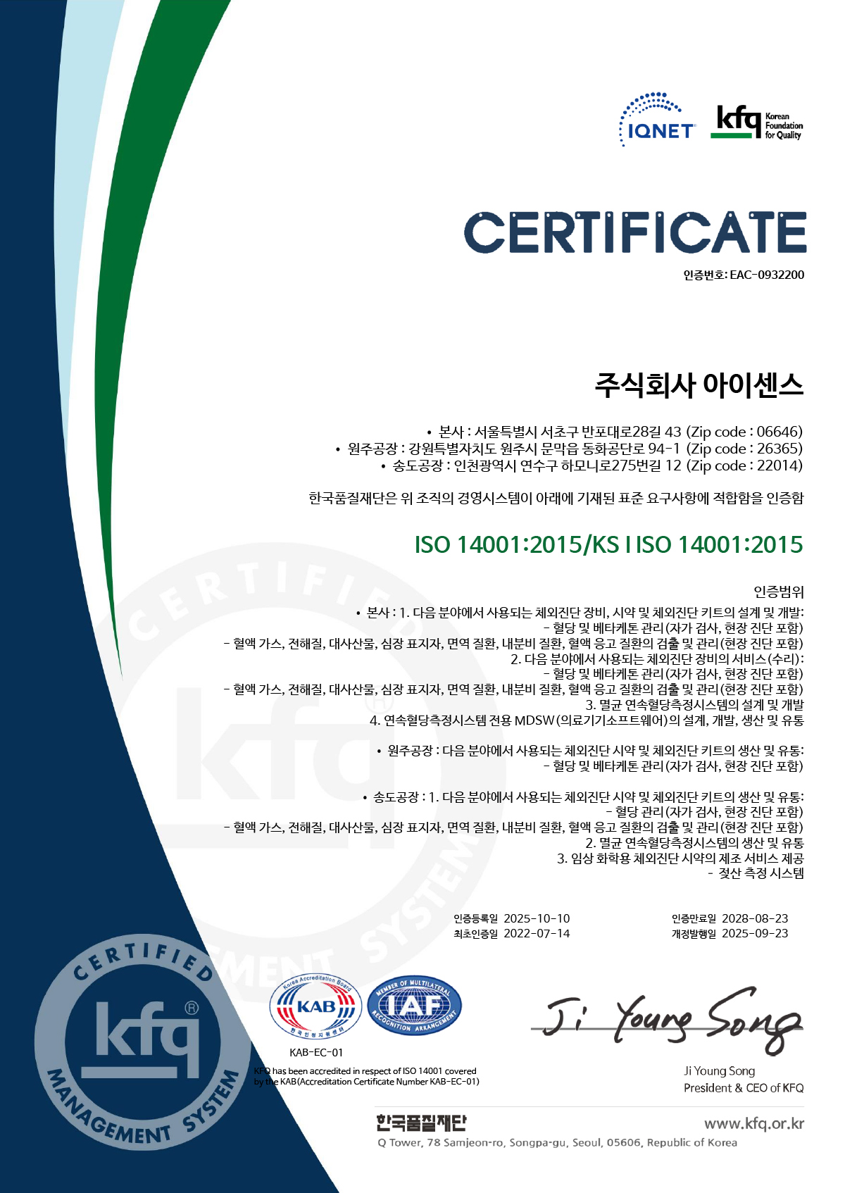 아이센스는 환경 국제표준 ISO 14001:2015 인증을 취득하여 환경경영시스템을 운영하고 있으며, 환경친화제품 개발로 환경오염을 예방하고 쾌적한 사업장 조성과 지구환경 보전을 기업의 경영방침으로 정하고 이에 따른 관리 체제를 구축하였습니다.